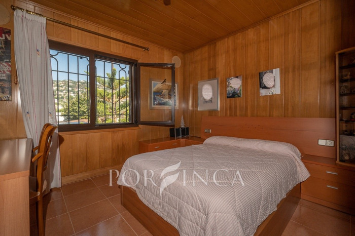 Mitjançant una escala interior accedim a la planta superior, on es troba la impressionant suite principal amb vestidor i bany privat. Aquesta estança també gaudeix d’unes vistes espectaculars al mar i té accés a una gran terrassa-solàrium, ideal per relaxar-se amb total intimitat. A la mateixa planta superior, abans d'arribar a la gran habitació en suite, trobem una còmoda habitació destinada a oficina.