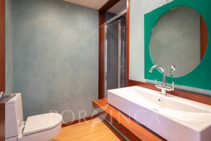 The kitchen will be furnished with high and low cabinets and a column for the oven and microwave, with a stratified finish from Santos. The countertop and front between high and low cabinets will be made of a natural quartz base, such as Silestone, and a white, single-bowl sink will be installed, with a low-flow mixer tap, thus reducing water consumption. A filtered water tap with a carbon filter will be installed. The equipment included in the kitchen will be: • Decorative extra-flat hood by Franke or similar. • Stainless steel electric oven and microwave by Franke or similar. • Induction hob.