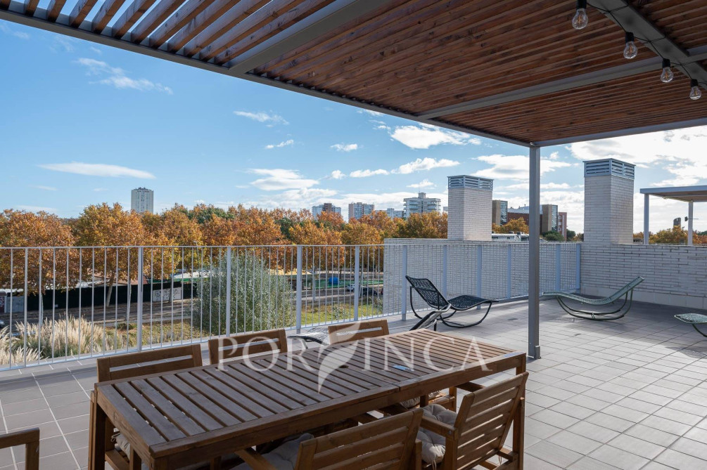 El vestíbulo de entrada da acceso a la espectacular azotea a través de una escalera de caracol. Esta terraza tiene 65 m2 y tiene una zona cubierta con barbacoa. Desde aquí se tiene una vista panorámica de la ciudad y del interior.