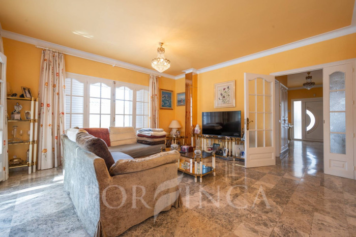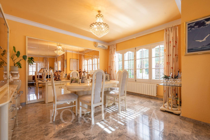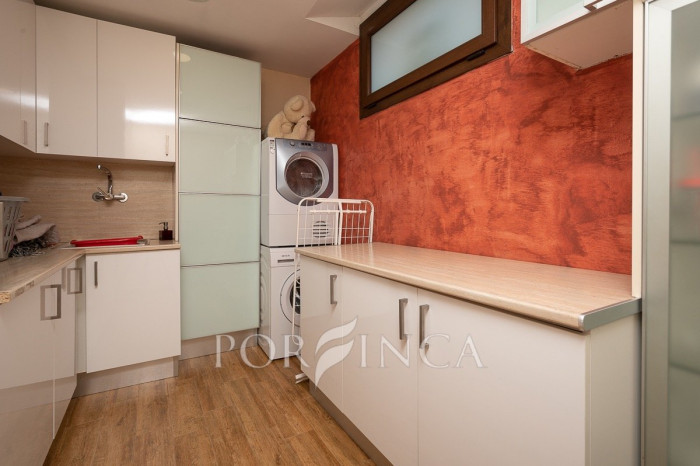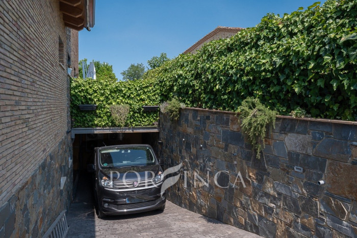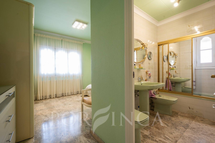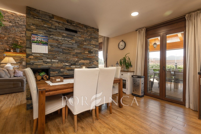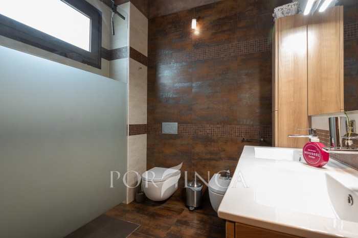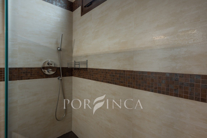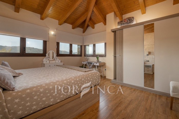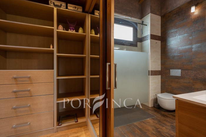 Pour accéder au premier étage, un escalier extérieur indépendant mène à une belle terrasse donnant sur l’entrée principale de la maison. À l’intérieur, un élégant hall en bois et en verre vous accueille dans une vaste salle à manger avec un petit bar, une cuisine entièrement équipée, deux chambres doubles et une chambre simple, toutes partageant une salle de bain complète. En descendant un élégant escalier intérieur, on accède à un espace bureau ainsi qu’à un autre salon avec cheminée, qui dispose d’un accès direct à la terrasse couverte surplombant la piscine. De l’autre côté de cet escalier intérieur se trouve la chambre principale, qui bénéficie de sa propre salle de bain privée.